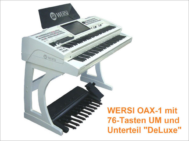 Ab sofort stehen das 76-Tasten Zusatzmanual sowie die brandneuen Holz-Unterteile für das WERSI SONIC OAX-1 Keyboard zur Verfügung. Das OAX-1 kann entweder direkt auf das Unterteil "Standard" oder auf das Unterteil "DeLuxe" gestellt werden. Wird das 76-Tasten Zusatzmanual verwendet, so wird zuerst das Zusatzmanual mit dem entsprechenden Holz-Unterteil verbunden und dann das OAX-1 Keyboard einfach auf das Zusatzmanual aufgesetzt.